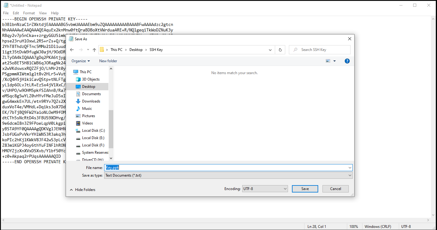 Copy đoạn mã Private Key ở mục Private Key vào Notepad và lưu file dưới định dạng .ppk bằng cách chọn Save As với Save as type là .ppk